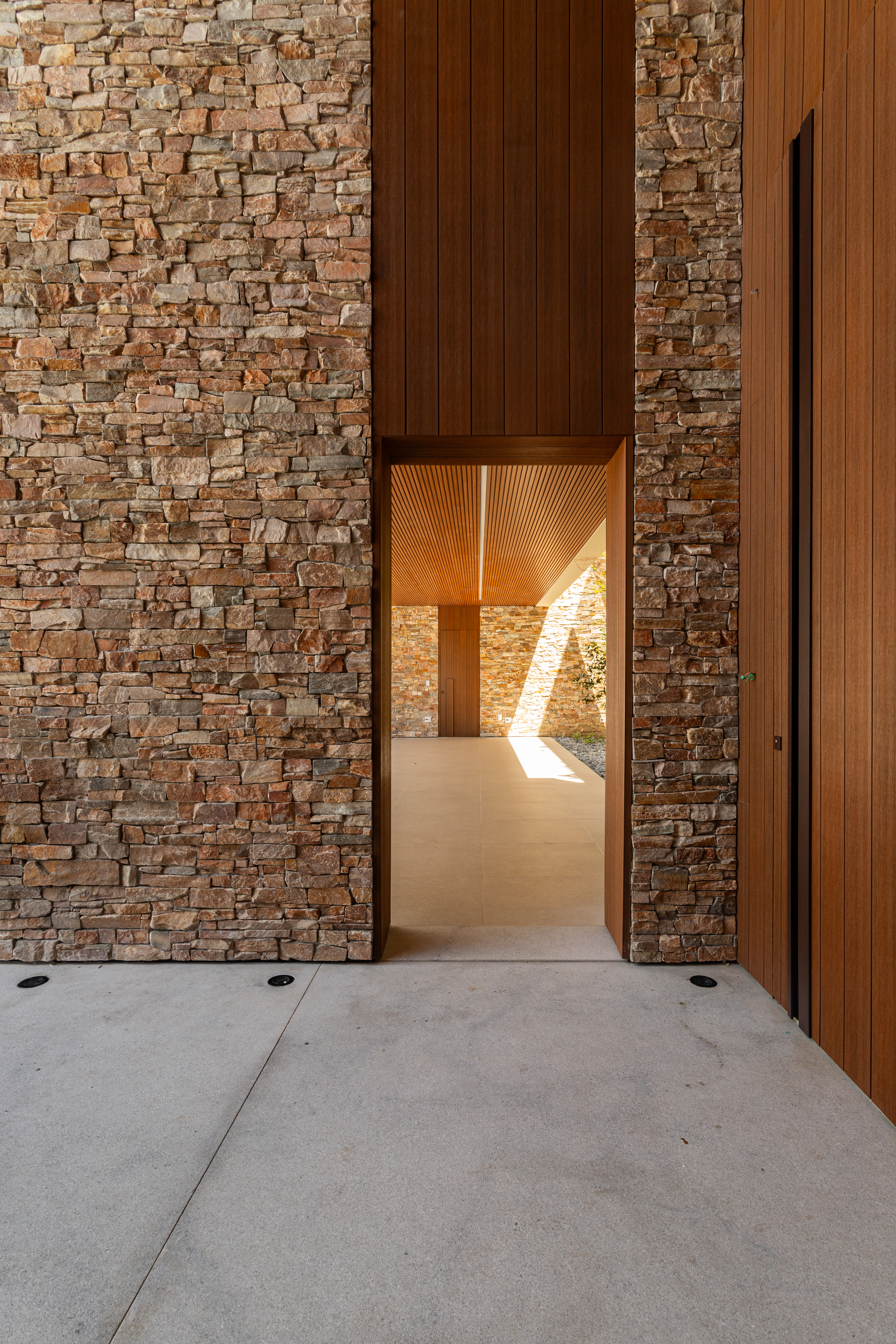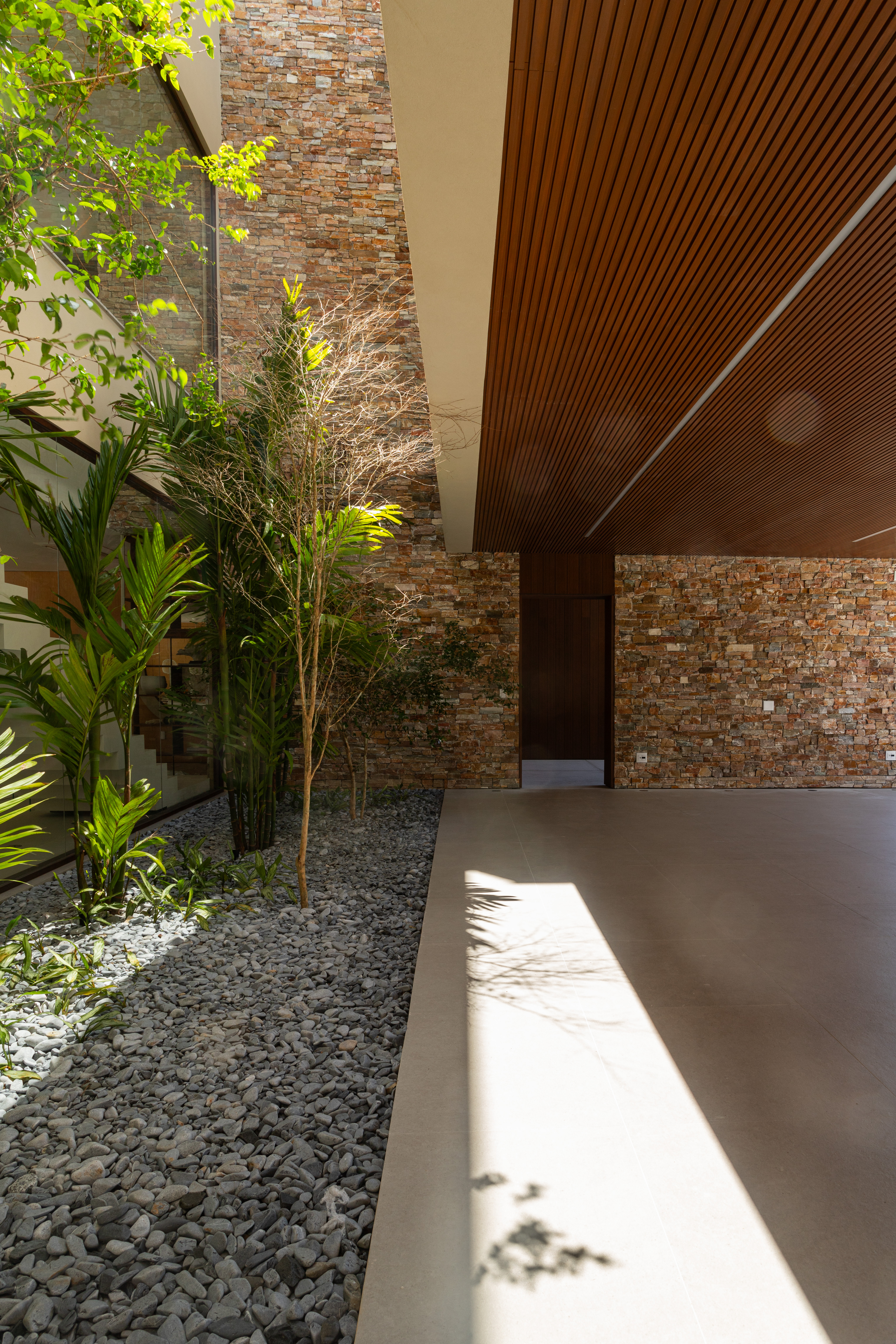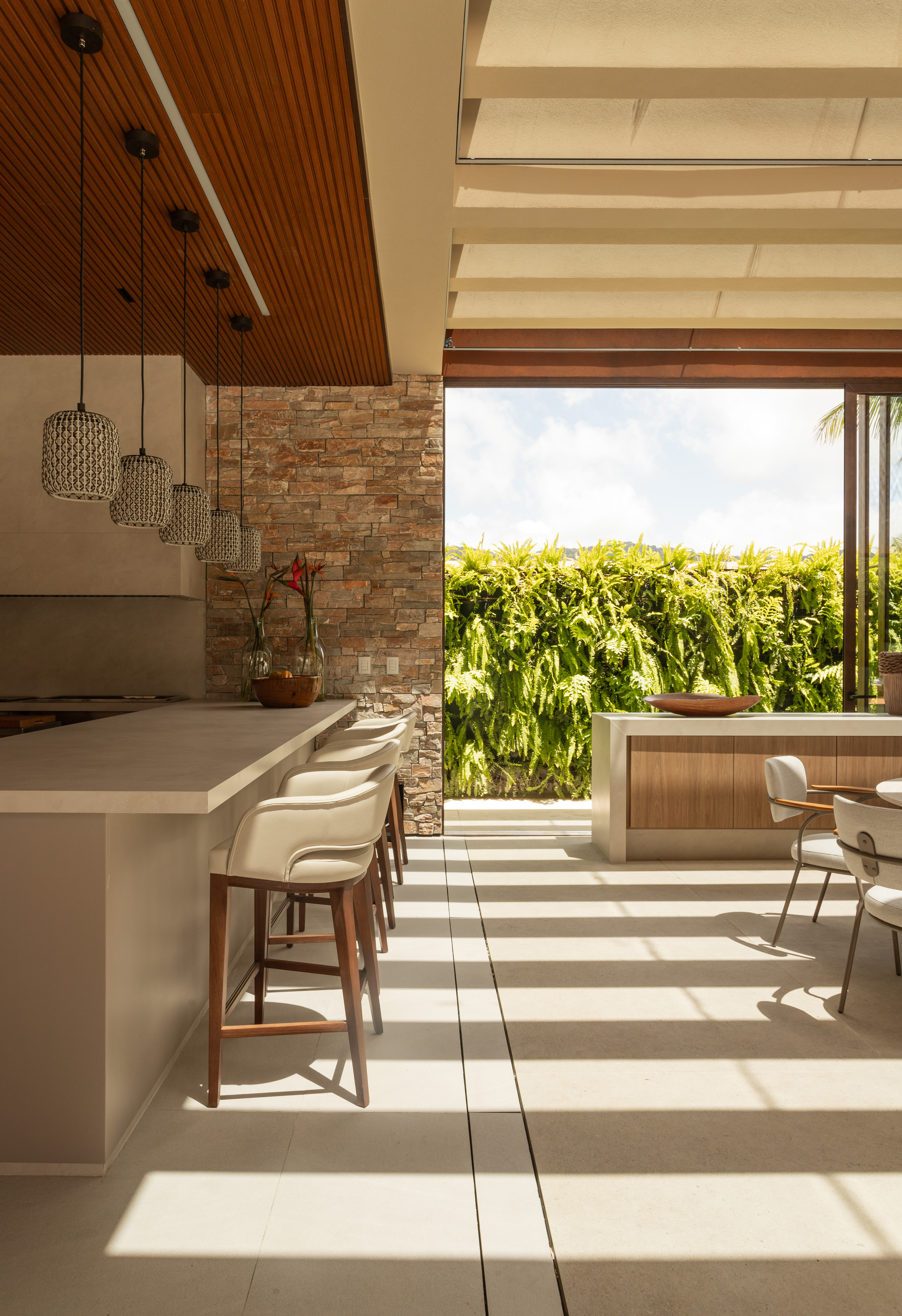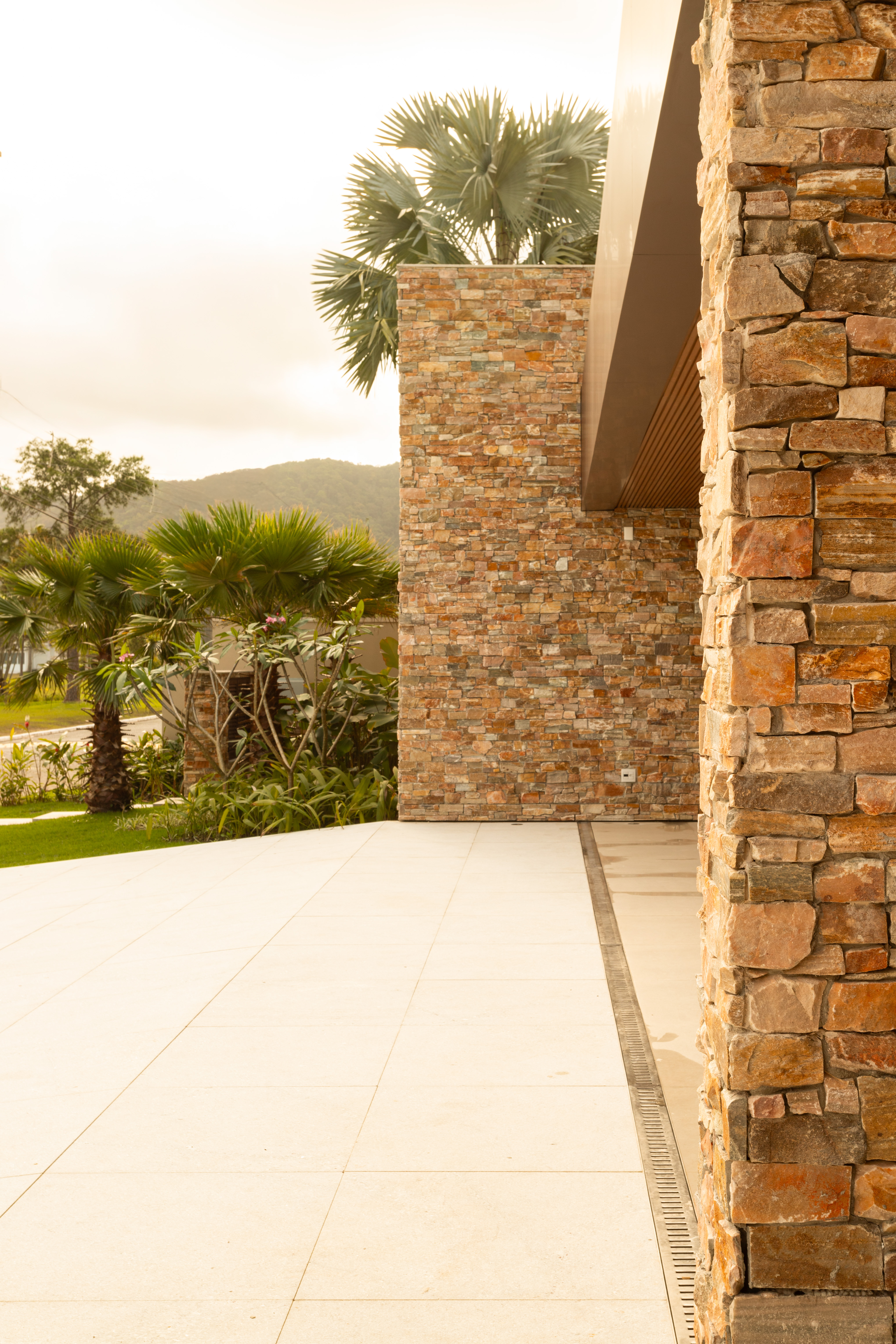 Para a fachada, Patricia optou por um elemento protagonista: a Trendwall Mountain, pedra natural fornecida pela Allform G. Suas tonalidades terrosas e textura orgânica criam um contraste elegante com a leveza dos vidros e a estrutura contemporânea da casa. Essa escolha não foi apenas estética: a pedra também garante resistência às condições do litoral, mantendo sua beleza por décadas.