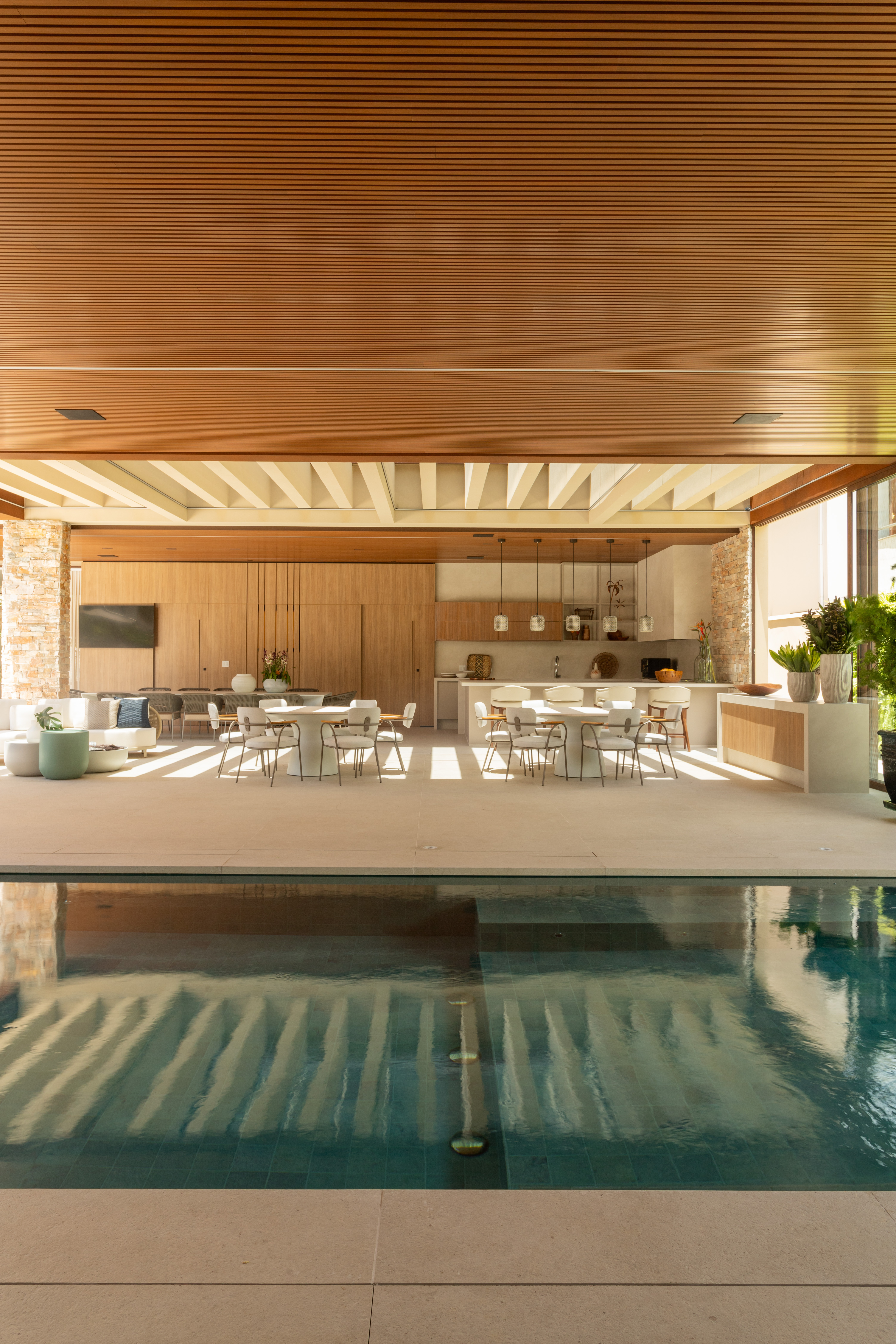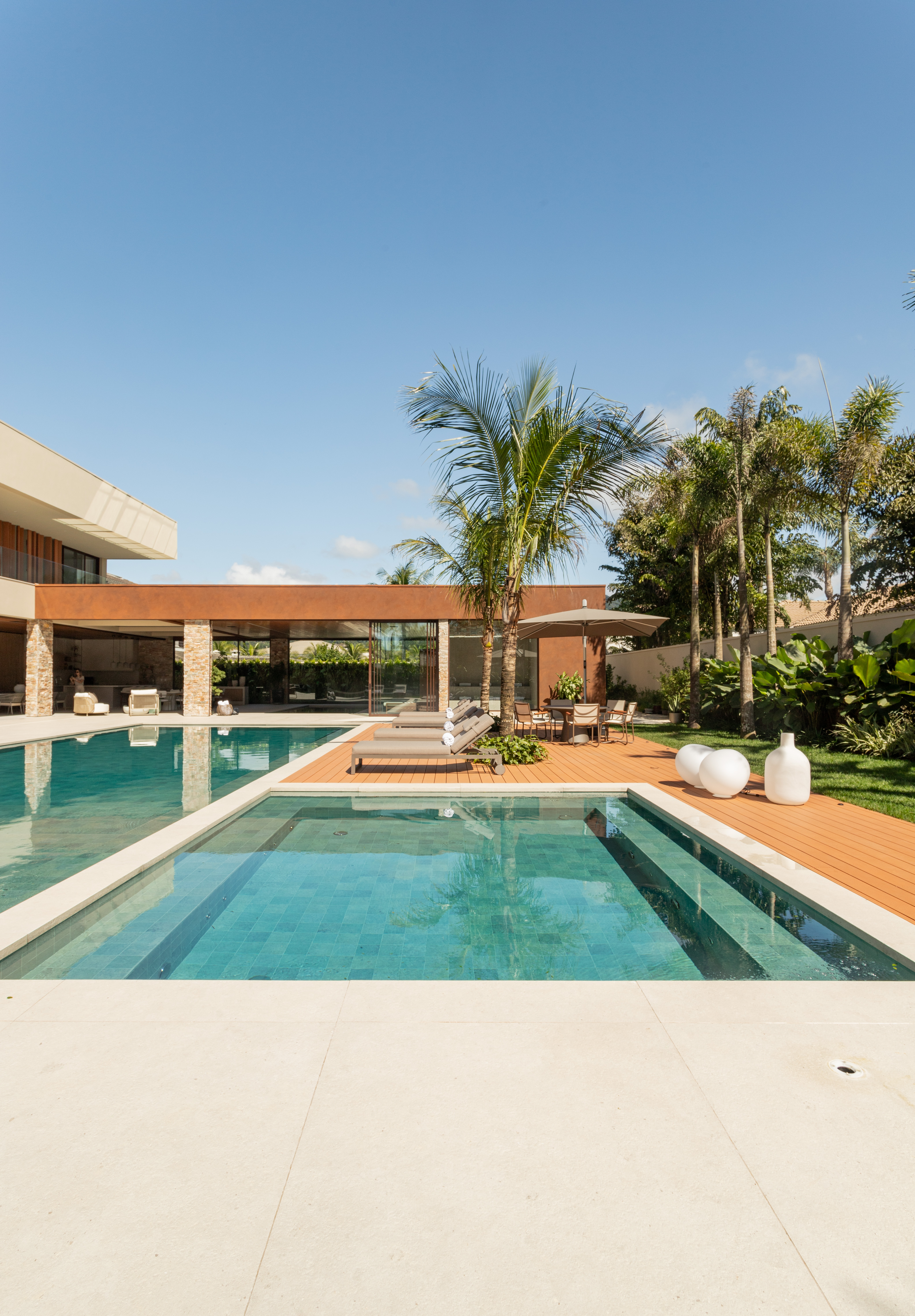 Na área externa, que se conecta diretamente à varanda gourmet e à piscina, foi especificado o Beige Catalan Strutturatto, porcelanato italiano exclusividade da Allform G. Seu acabamento texturizado e antideslizante une segurança e elegância, além de manter o visual sofisticado em contato direto com a natureza.