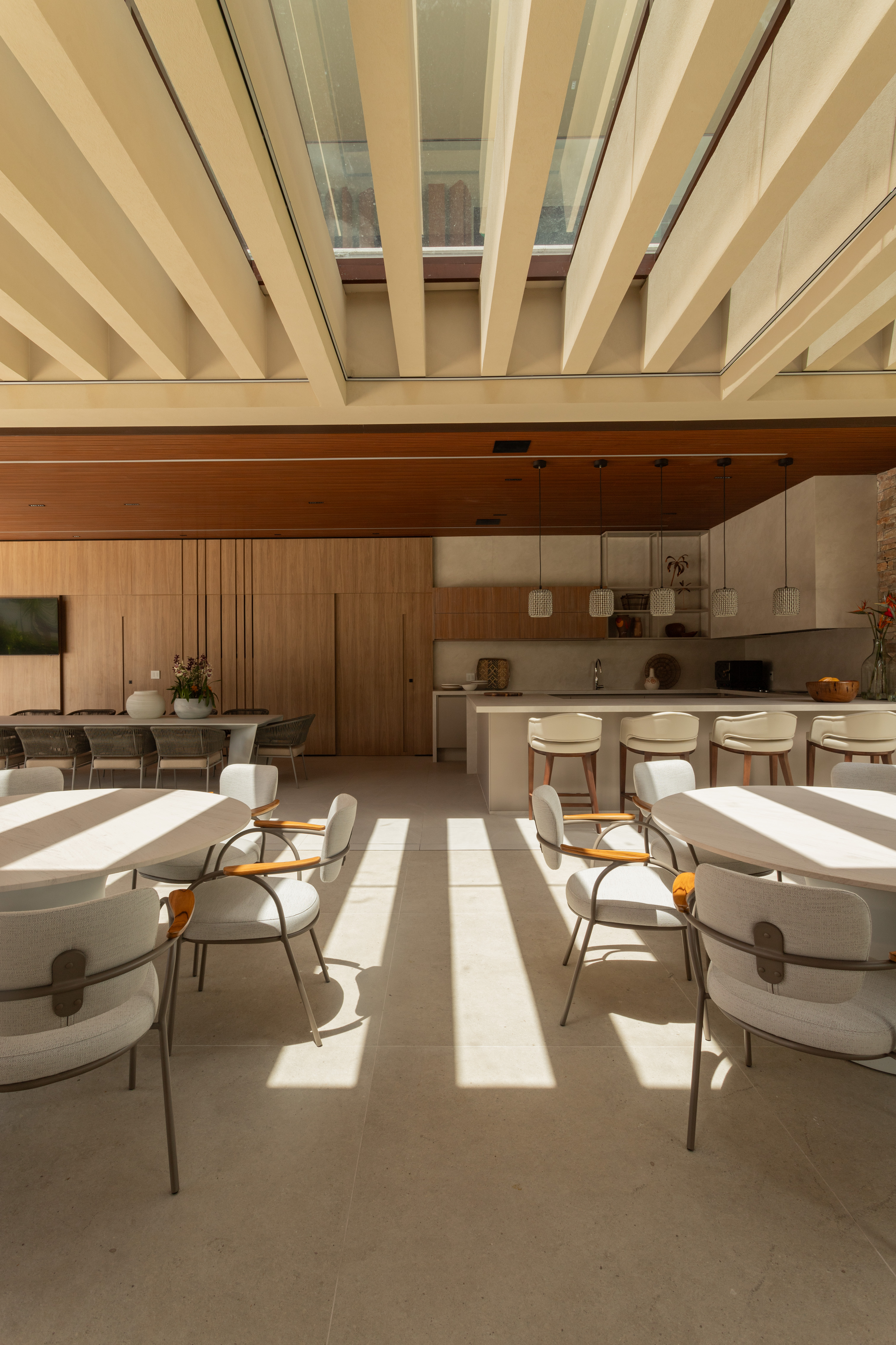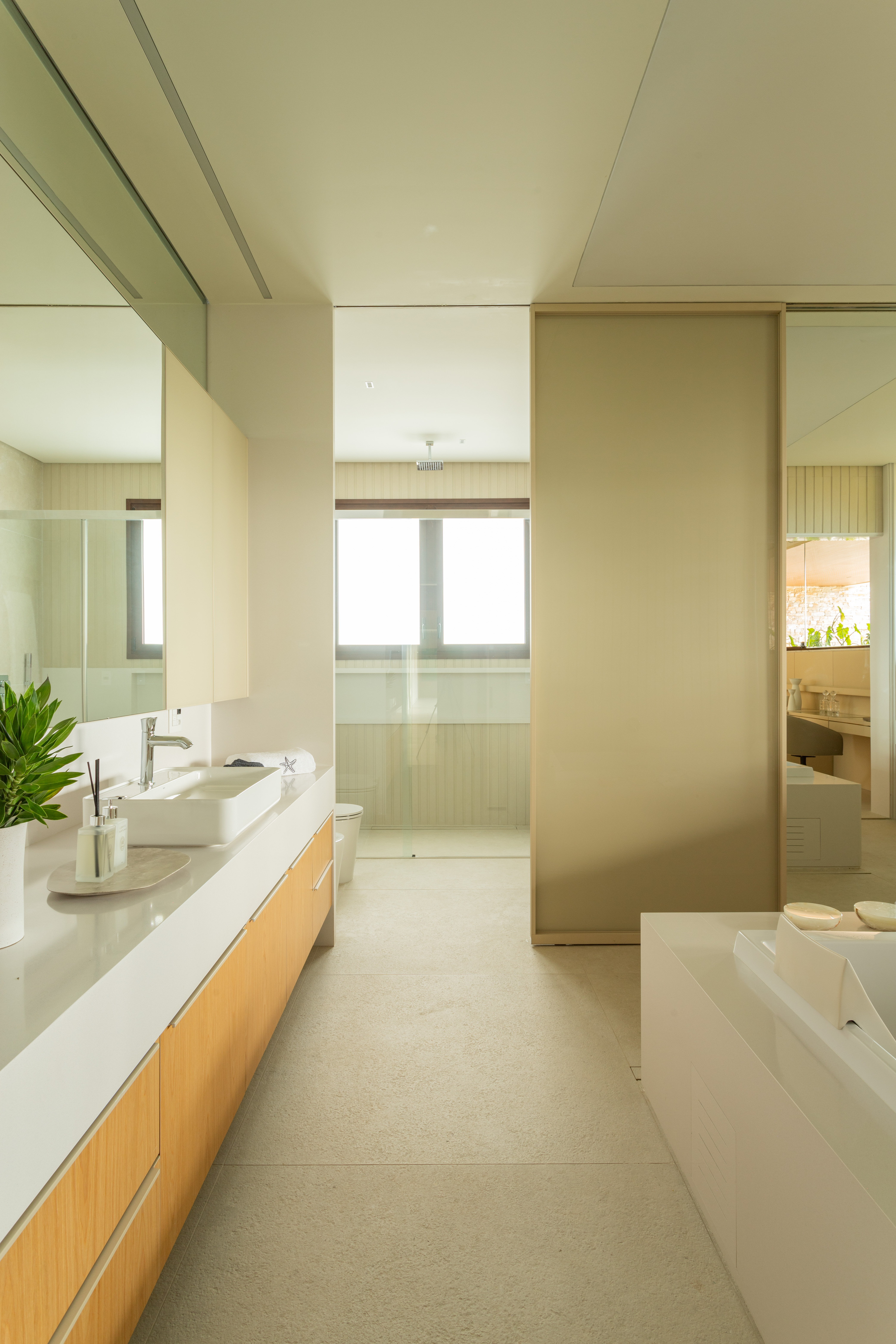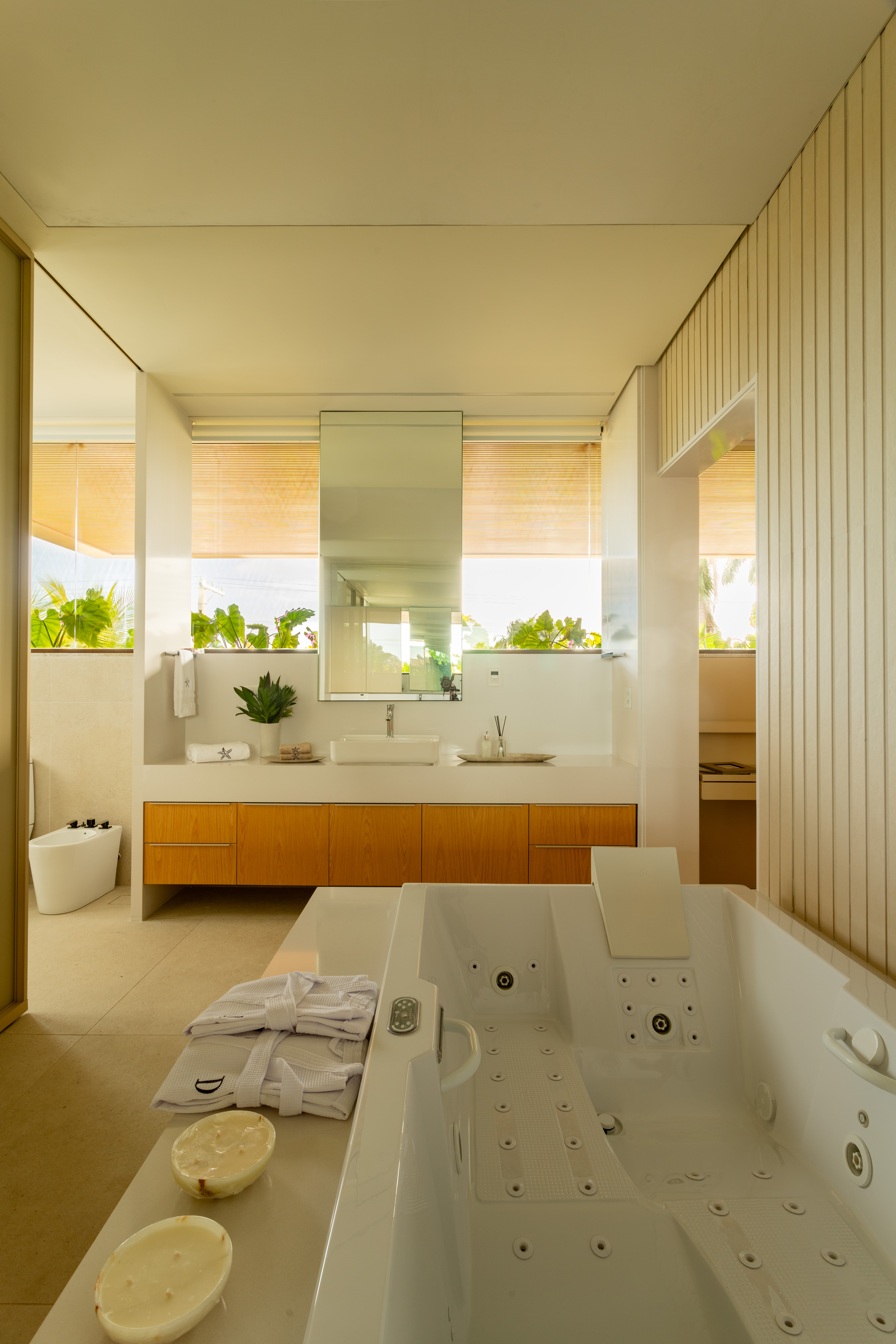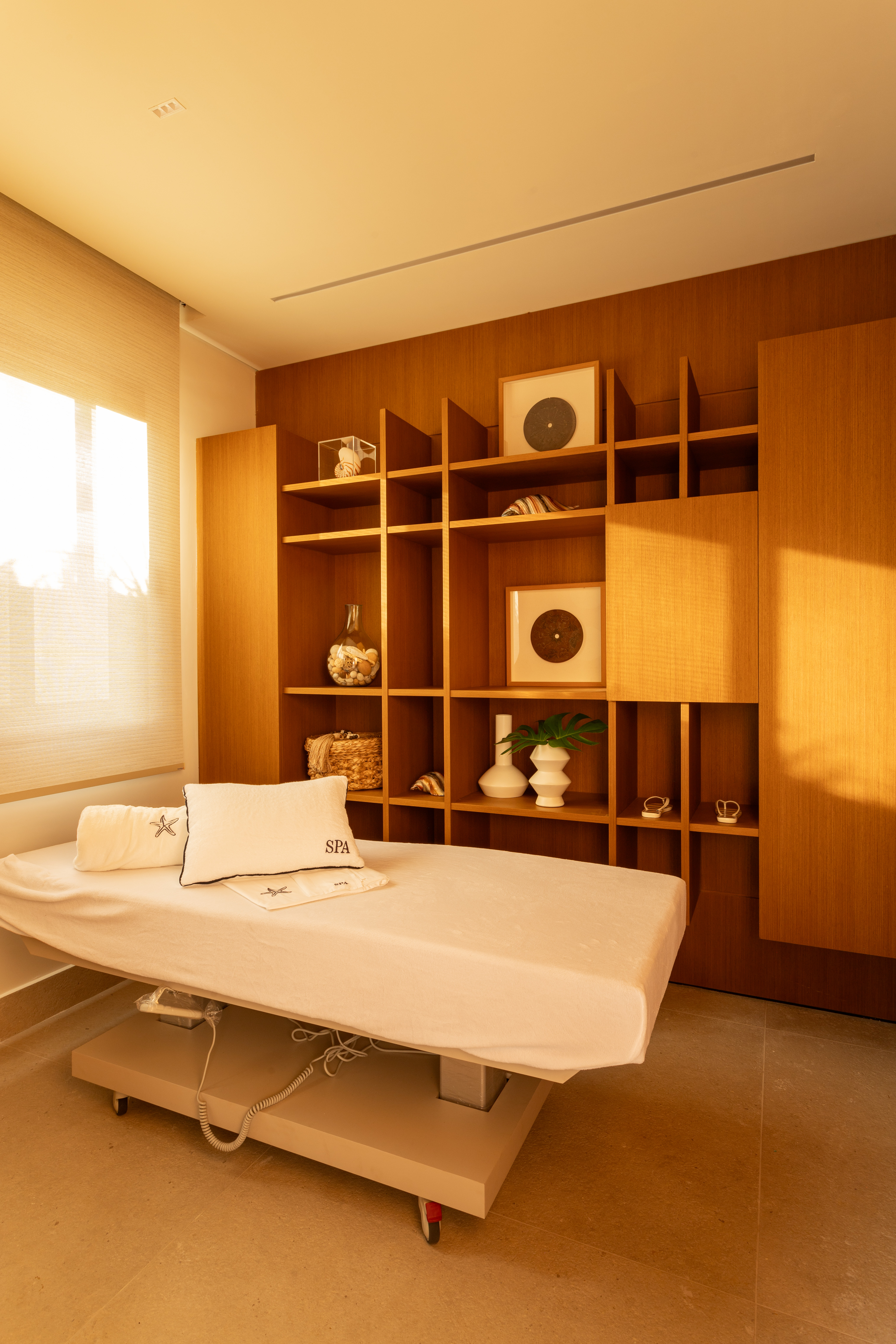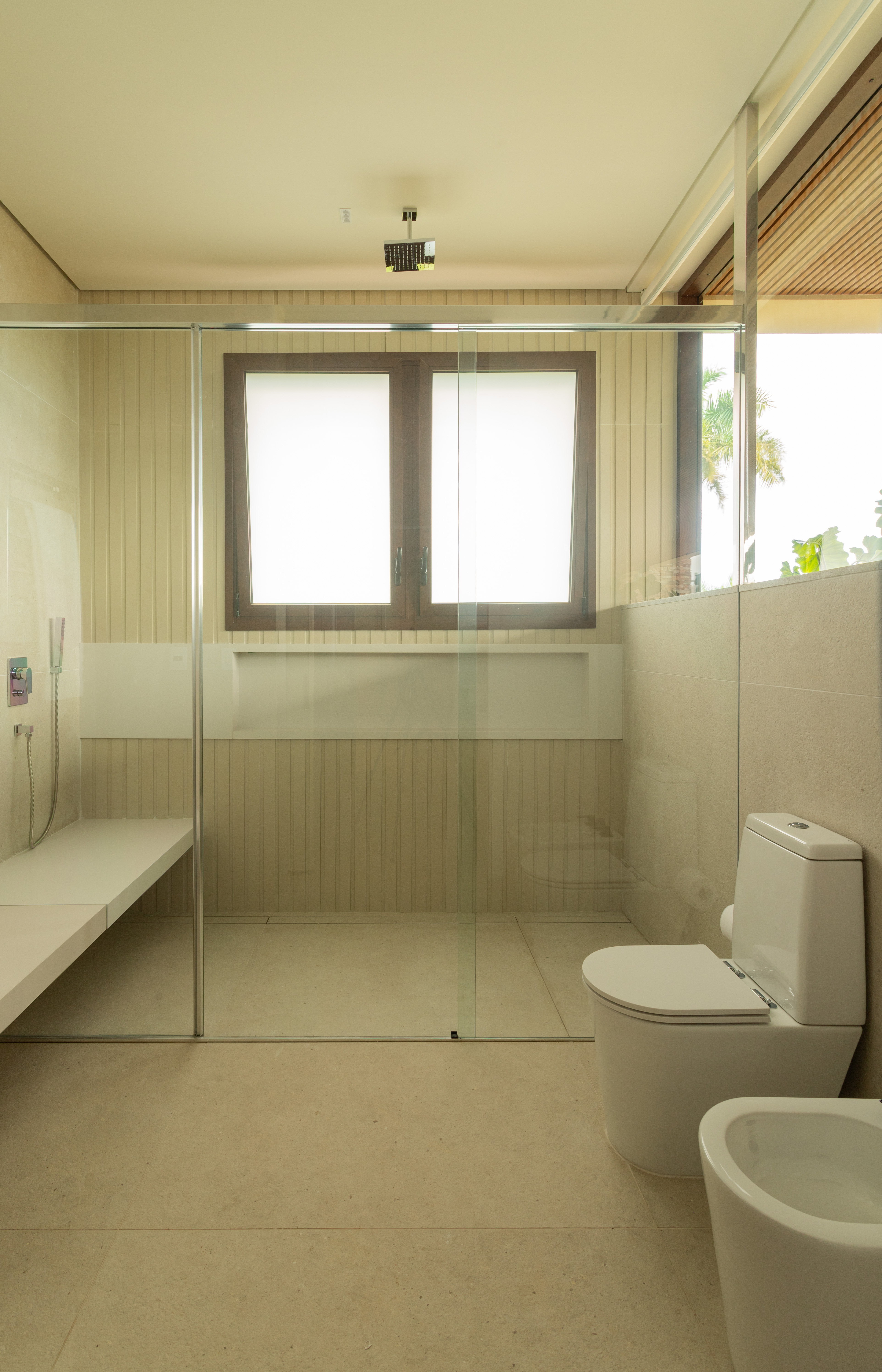 A versatilidade do Beige Catalan Strutturatto também se destaca nos ambientes íntimos do projeto, como o spa e o banheiro da suíte master. Nesses espaços, o porcelanato reforça a sensação de continuidade visual e acolhimento, unindo conforto tátil, elegância natural e alta resistência à umidade. Sua tonalidade neutra e sofisticada permite composições suaves e atemporais, criando verdadeiros refúgios de bem-estar.